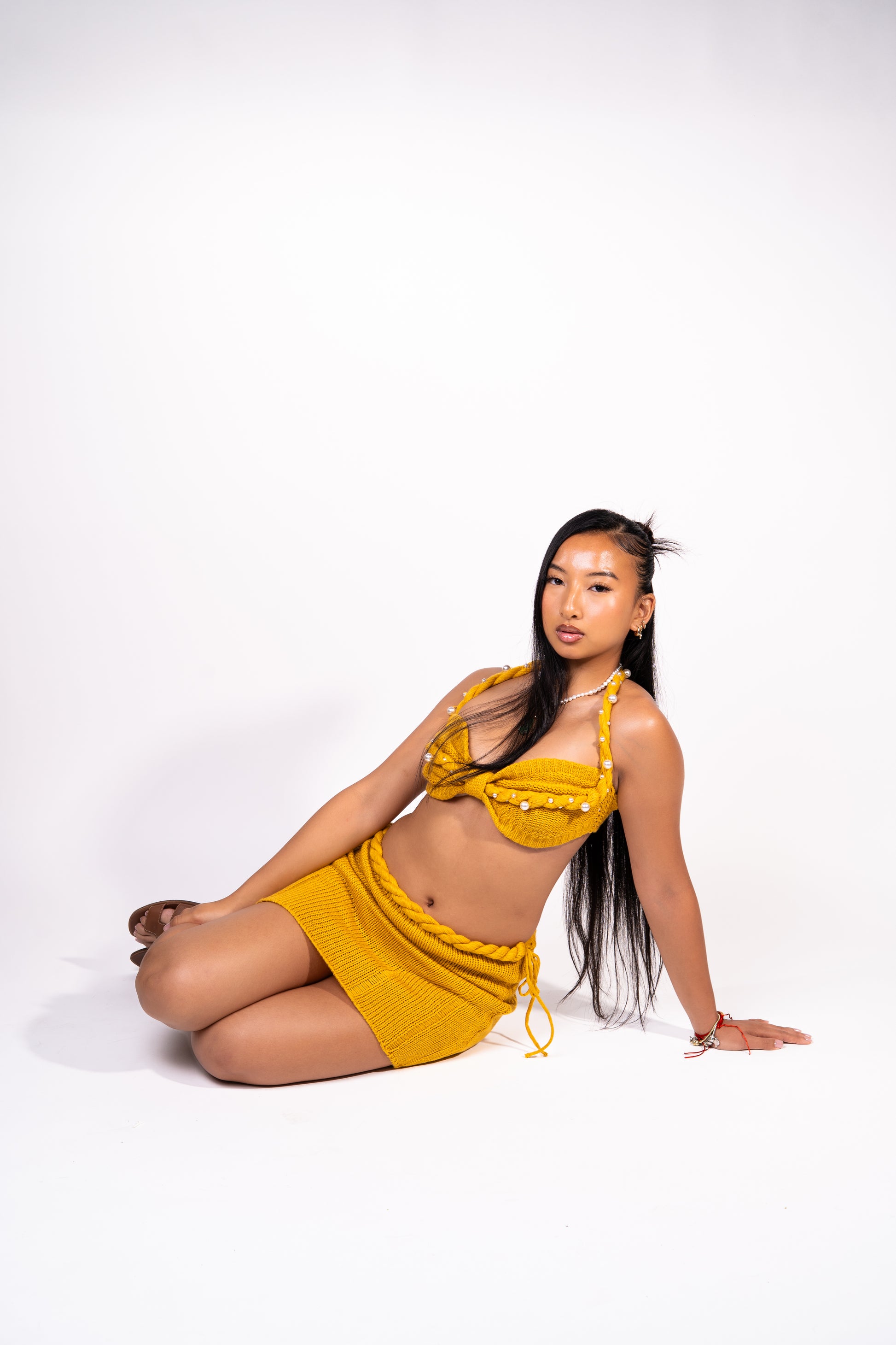 This two-piece set features a hand-knitted crop top and matching mini skirt, designed in a rich mustard hue that flatters every skin tone.